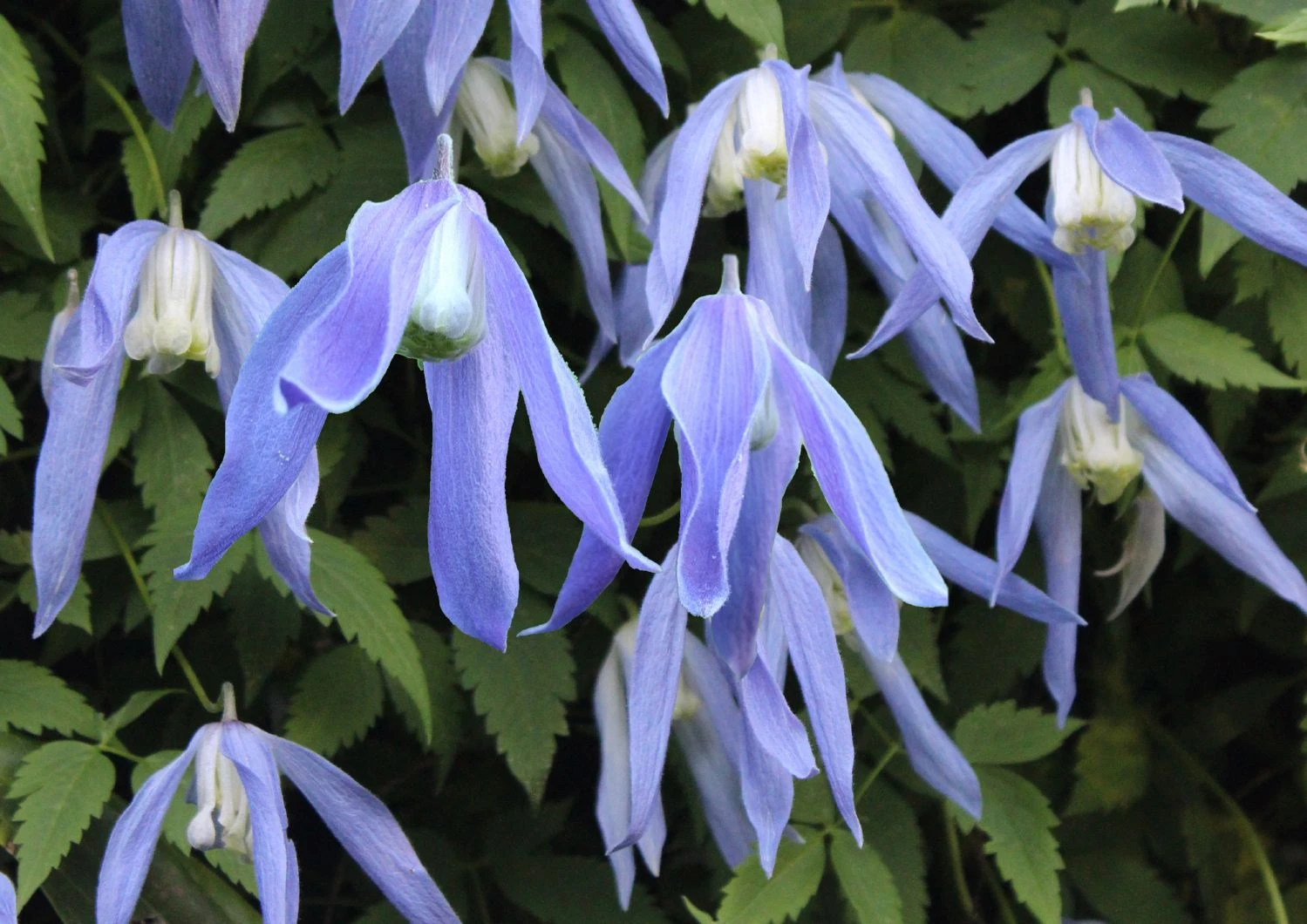 Clematis alpina ‚Frances Rivis‘ ist eine wundervolle Sorte unter den Alpen-Waldreben. Sie blüht bereits ab April und besticht mit schlanken, lilablauen, nickenden Blüten. Sie eignet sich gut zur Begrünung von feingliedrigen Zäunen oder Pergolen und lässt sich durch ihren gemäßigten Wuchs von 3 m Höhe gut bändigen.