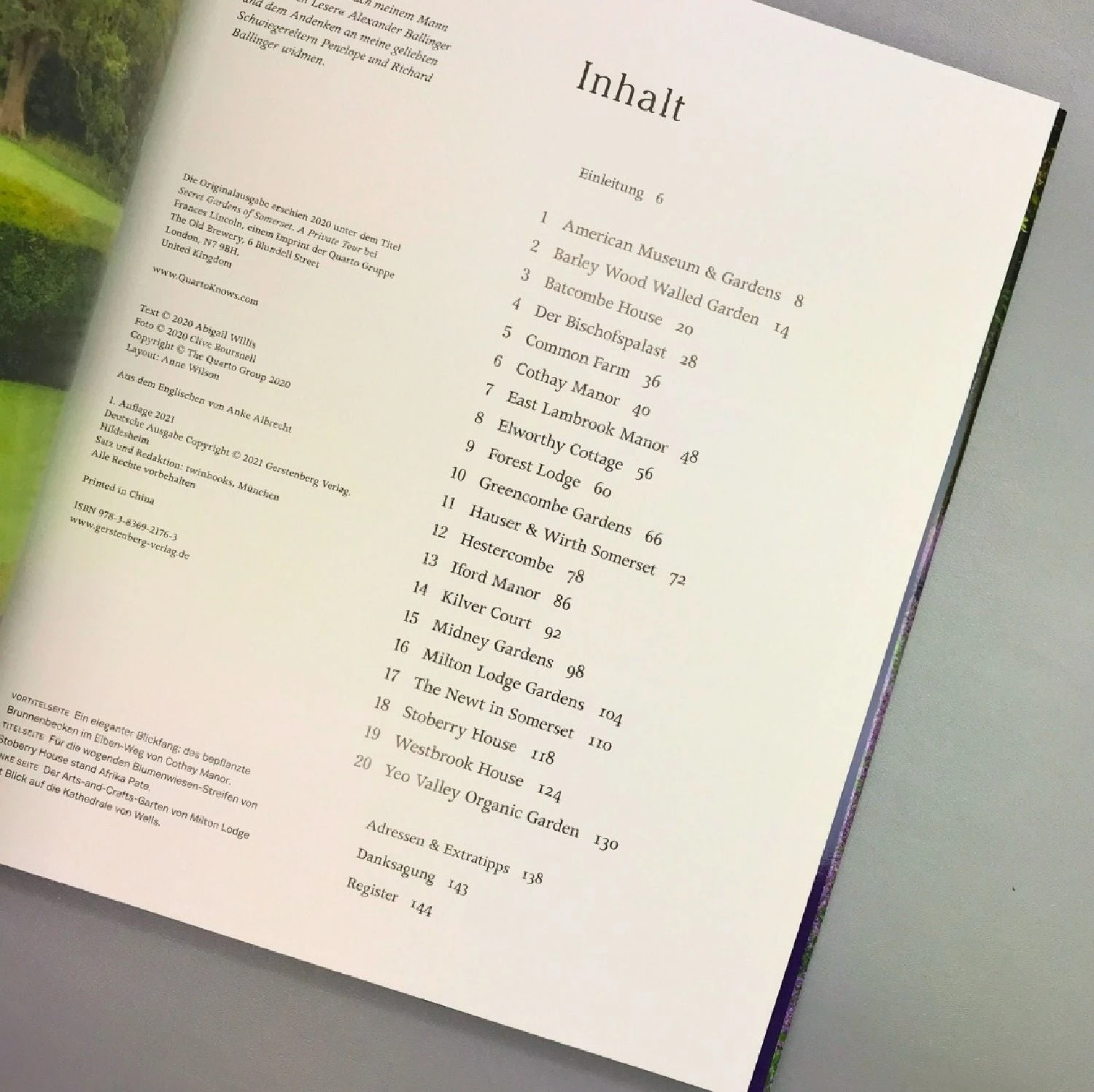 Somerset zählt zu den reizvollsten Grafschaften Englands und zieht jährlich Tausende von Touristen an. Abigail Willis und Clive Boursnell gewähren exklusiven Zutritt zu 20 der schönsten Gärten Somersets. Porträtiert werden Geschichte, Gestaltung und Pflanzensammlung der jeweiligen Gärten sowie deren hingebungsvolle Besitzer und Chefgärtner. Berühmte Gartengestalter wie Harold Peto, Gertrude Jekyll oder Piet Oudolf haben in den prächtigen Anlagen im Südwesten Englands ihre unverwechselbaren Spuren hinterlassen und eine ganz besondere Atmospäre geschaffen, wie sie nur ein englischer Garten auf dem Lande bietet. Alle Gärten sind zu bestimmten Zeiten im Jahr für Besucher geöffnet.
