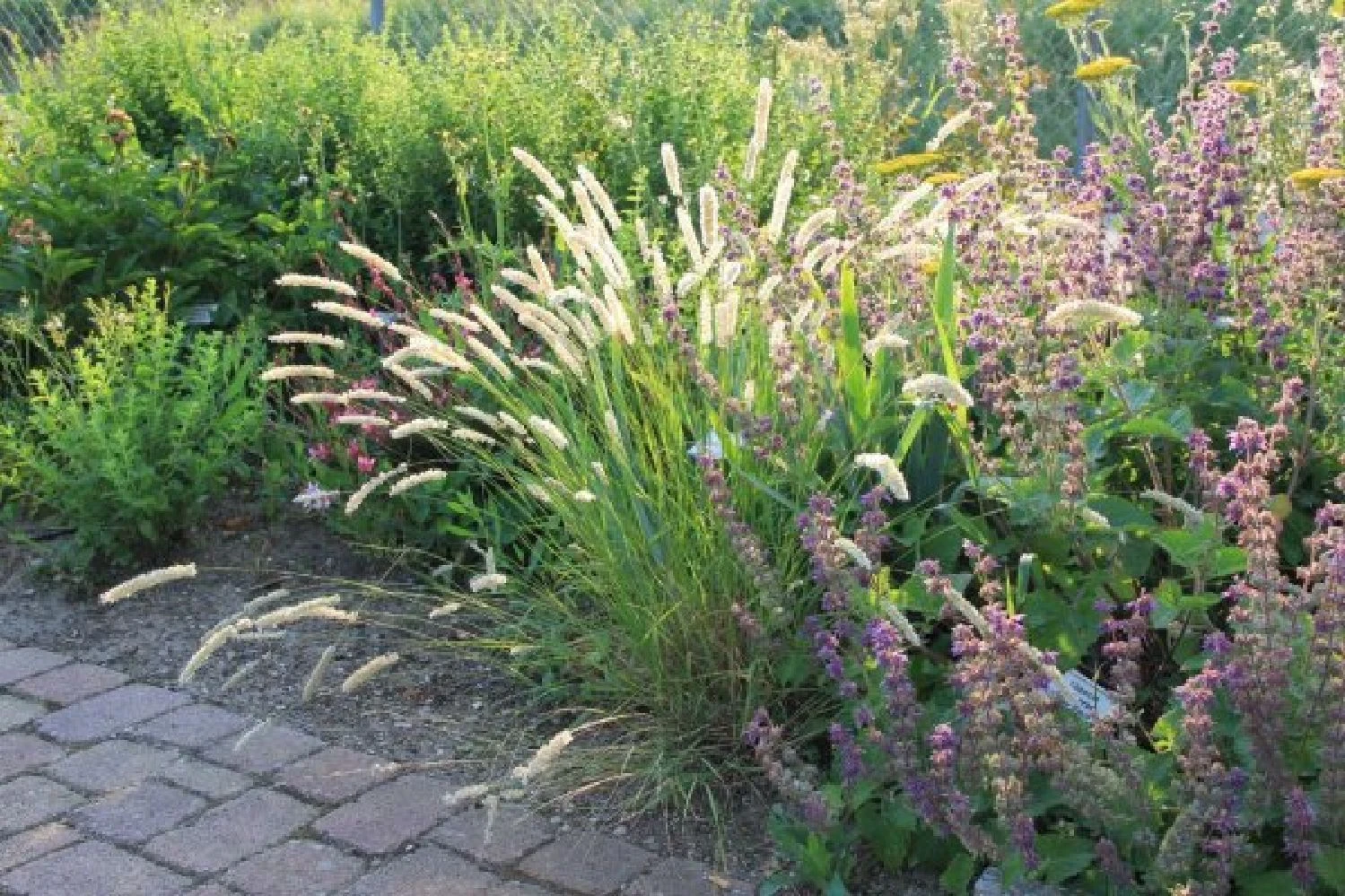 Für weitere Farbtupfer sorgen ergänzende Blütenstauden, die in die Pflanzung eingestreut sind. So leuchtet von Hochsommer bis Herbst rosafarbener Purpursonnenhut zwischen den Gräserhorsten. Zart schwebt hohes Eisenkraut über allem und ergänzt sich prächtig mit hohem Kandelaber-Ehrenpreis. Weiße Blütchen breitet die zartstängelige Prachtkerze ab Juni aus und blüht unermüdlich bis in den November. Für einen Hauch Extravaganz sorgt eine Edeldistel mit ihren silbergrauen Blütenkugeln, die sich auf langen Stängeln über den Gräsern erheben. Zwei aromatische Duftnesseln runden das Ensemble mit violetten Kerzenblüten ab. Und das Beste an dieser Pflanzenkomposition? Sie ist trotz Pflegeleichtigkeit auch insektenfreundlich, denn alle Blütenstauden bieten sowohl Bienen als auch Hummeln und Faltern viel Nektar.