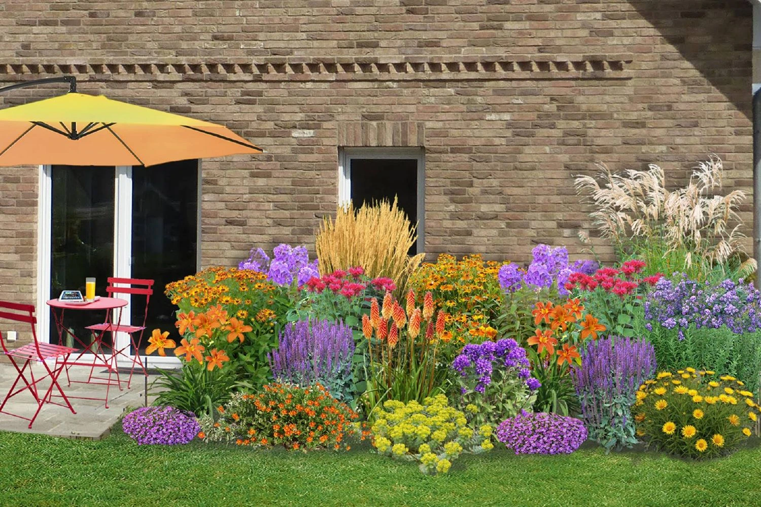 Wer das Beetpaket ‚Leuchtfeuer‘ pflanzt, sorgt für fröhliche Farbtupfer von April bis Oktober. Den Auftakt bildet im April lila Blaukissen, das im Mai rasch Begleitung von violettem Ziersalbei, limettenfarbiger Walzenwolfsmilch und orangefarbenem Sonnenröschen erhält. Kommt der Hochsommer läuft auch das Beet zu Hochformen auf. Nun folgen die exotisch anmutende Fackellilie mit ihren bürstenförmigen Blüten, aromatische Indianernessel in Blutrot, duftende Hohe Flammenblume, strahlend gelber Alant, lilablaue Knäuelglockenblume sowie blühfreudige Taglilien. Im Spätsommer und Frühherbst ergänzen orangefarbene Sonnenbraut und samtig-violette Raublattaster das Ensemble. Für die nötige Struktur im Beet sorgen Ziergräser wie Garten-Reitgras und hohes Chinaschilf. Ab Juli bilden sie ihre Blüten aus. Dabei formt das Reitgras straff aufrechte Halme, die sich sanft im Wind wiegen, während das Chinaschilf im Herbst mit atemberaubenden, federartigen Samenständen aufwartet, die an die Silberregen eines Feuerwerks erinnern.