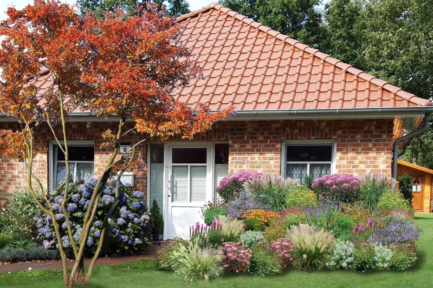 Ein noch recht leer wirkender Vorgarten kann Herausforderung und Chance zugleich sein, bietet er doch eine perfekte Leinwand für die Beet-Idee ‚New German Style‘. In diesem Fall besaß der Vorgarten eines Einfamilienhauses erst ein Beet entlang einer Hausseite. Um für optische Balance zu sorgen, empfiehlt es sich, auch die rechte Hausseite mit einem passenden Beet zu bespielen.